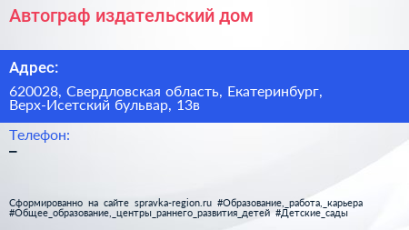 Автограф, издательский дом по адресу 620028, Свердловская область, Екатеринбург, Верх-Исетский бульвар, 13в в дальнейшем Организация, размещена в следующих категориях: