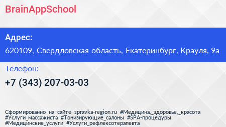 BrainAppSchool по адресу 620109, Свердловская область, Екатеринбург, Крауля, 9а в дальнейшем Организация, размещена в следующих категориях: