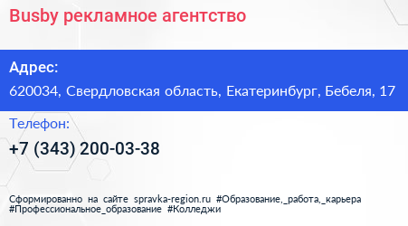 Busby, рекламное агентство по адресу 620034, Свердловская область, Екатеринбург, Бебеля, 17 в дальнейшем Организация, размещена в следующих категориях: