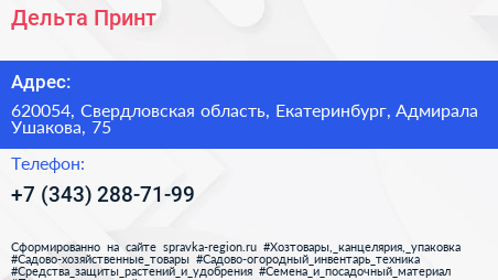 Дельта-Принт по адресу 620054, Свердловская область, Екатеринбург, Адмирала Ушакова, 75 в дальнейшем Организация, размещена в следующих категориях: