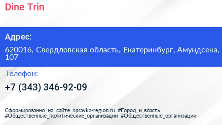 Dine Trin по адресу 620016, Свердловская область, Екатеринбург, Амундсена, 107 в дальнейшем Организация, размещена в следующих категориях: