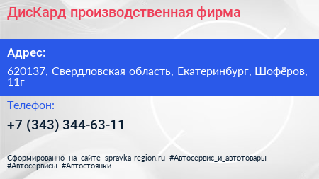 ДисКард, производственная фирма по адресу 620137, Свердловская область, Екатеринбург, Шофёров, 11г в дальнейшем Организация, размещена в следующих категориях: