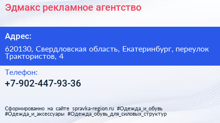 Эдмакс, рекламное агентство по адресу 620130, Свердловская область, Екатеринбург, переулок Трактористов, 4 в дальнейшем Организация, размещена в следующих категориях: