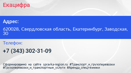 Екацифра по адресу 620028, Свердловская область, Екатеринбург, Заводская, 30 в дальнейшем Организация, размещена в следующих категориях:
