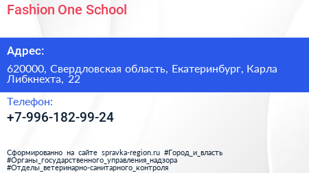Fashion One School по адресу 620000, Свердловская область, Екатеринбург, Карла Либкнехта, 22 в дальнейшем Организация, размещена в следующих категориях: