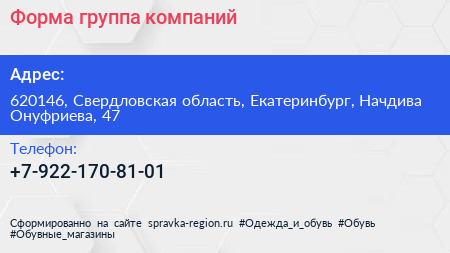 Форма, группа компаний по адресу 620146, Свердловская область, Екатеринбург, Начдива Онуфриева, 47 в дальнейшем Организация, размещена в следующих категориях: