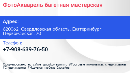 ФотоАкварель, багетная мастерская по адресу 620062, Свердловская область, Екатеринбург, Первомайская, 70 в дальнейшем Организация, размещена в следующих категориях: