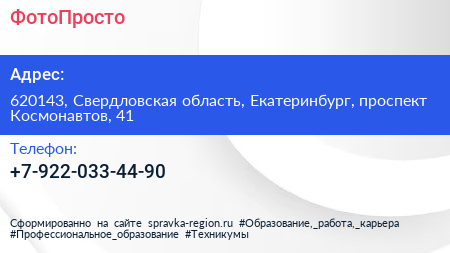 ФотоПросто по адресу 620143, Свердловская область, Екатеринбург, проспект Космонавтов, 41 в дальнейшем Организация, размещена в следующих категориях: