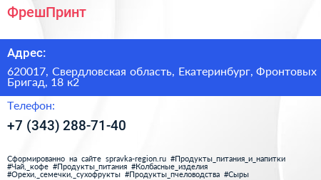 ФрешПринт по адресу 620017, Свердловская область, Екатеринбург, Фронтовых Бригад, 18 к2 в дальнейшем Организация, размещена в следующих категориях: