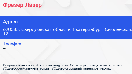 Фрезер-Лазер по адресу 620085, Свердловская область, Екатеринбург, Смоленская, 12 в дальнейшем Организация, размещена в следующих категориях: