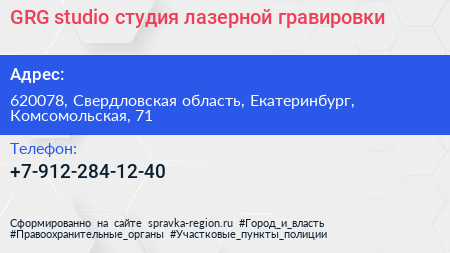GRG studio, студия лазерной гравировки по адресу 620078, Свердловская область, Екатеринбург, Комсомольская, 71 в дальнейшем Организация, размещена в следующих категориях: