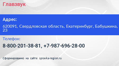 Главзвук по адресу 620091, Свердловская область, Екатеринбург, Бабушкина, 23 в дальнейшем Организация, размещена в следующих категориях: