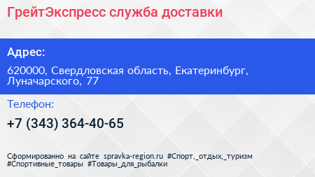 ГрейтЭкспресс, служба доставки по адресу 620000, Свердловская область, Екатеринбург, Луначарского, 77 в дальнейшем Организация, размещена в следующих категориях: