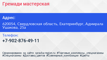 Гремади, мастерская по адресу 620054, Свердловская область, Екатеринбург, Адмирала Ушакова, 25а в дальнейшем Организация, размещена в следующих категориях: