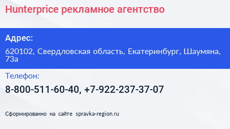 Hunterprice, рекламное агентство по адресу 620102, Свердловская область, Екатеринбург, Шаумяна, 73а в дальнейшем Организация, размещена в следующих категориях: