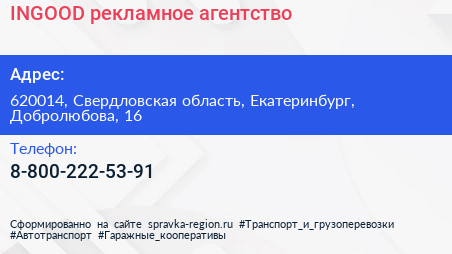 INGOOD, рекламное агентство по адресу 620014, Свердловская область, Екатеринбург, Добролюбова, 16 в дальнейшем Организация, размещена в следующих категориях: