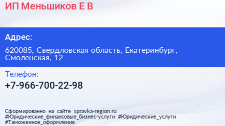 ИП Меньшиков Е.В. по адресу 620085, Свердловская область, Екатеринбург, Смоленская, 12 в дальнейшем Организация, размещена в следующих категориях: