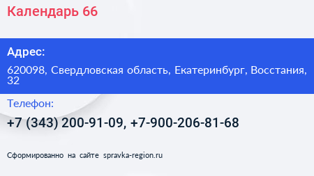 Календарь 66 по адресу 620098, Свердловская область, Екатеринбург, Восстания, 32 в дальнейшем Организация, размещена в следующих категориях: