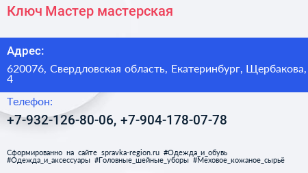 Ключ Мастер, мастерская по адресу 620076, Свердловская область, Екатеринбург, Щербакова, 4 в дальнейшем Организация, размещена в следующих категориях:
