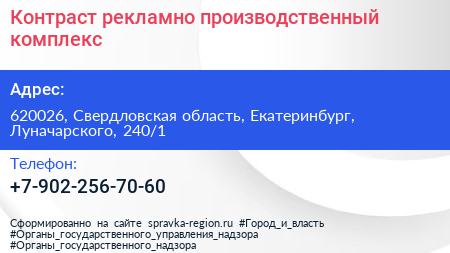 Контраст, рекламно-производственный комплекс по адресу 620026, Свердловская область, Екатеринбург, Луначарского, 240/1 в дальнейшем Организация, размещена в следующих категориях: