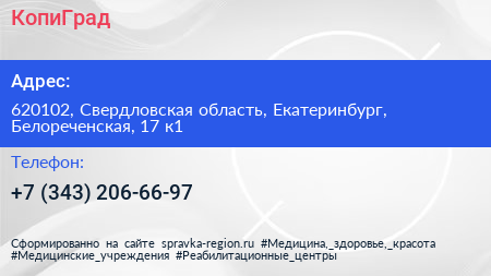 КопиГрад по адресу 620102, Свердловская область, Екатеринбург, Белореченская, 17 к1 в дальнейшем Организация, размещена в следующих категориях: