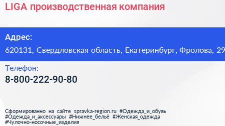 LIGA, производственная компания по адресу 620131, Свердловская область, Екатеринбург, Фролова, 29 в дальнейшем Организация, размещена в следующих категориях: