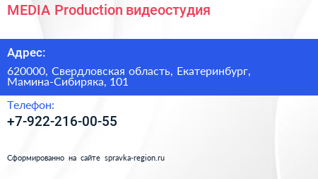 MEDIA Production, видеостудия по адресу 620000, Свердловская область, Екатеринбург, Мамина-Сибиряка, 101 в дальнейшем Организация, размещена в следующих категориях: