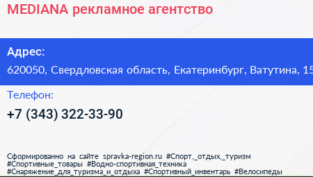 MEDIANA, рекламное агентство по адресу 620050, Свердловская область, Екатеринбург, Ватутина, 15 в дальнейшем Организация, размещена в следующих категориях:
