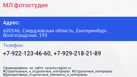 МЛ, фотостудия по адресу 620146, Свердловская область, Екатеринбург, Волгоградская, 193 в дальнейшем Организация, размещена в следующих категориях: