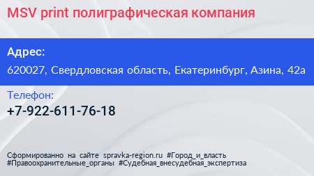 MSV-print, полиграфическая компания по адресу 620027, Свердловская область, Екатеринбург, Азина, 42а в дальнейшем Организация, размещена в следующих категориях: