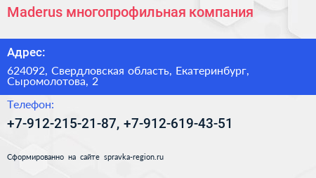 Maderus, многопрофильная компания по адресу 624092, Свердловская область, Екатеринбург, Сыромолотова, 2 в дальнейшем Организация, размещена в следующих категориях: