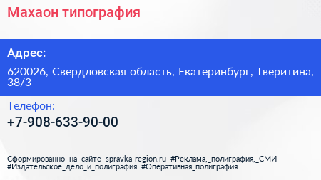 Махаон, типография по адресу 620026, Свердловская область, Екатеринбург, Тверитина, 38/3 в дальнейшем Организация, размещена в следующих категориях: