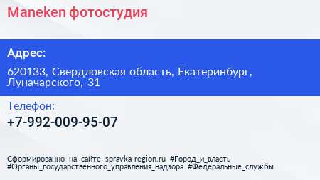 Maneken, фотостудия по адресу 620133, Свердловская область, Екатеринбург, Луначарского, 31 в дальнейшем Организация, размещена в следующих категориях: