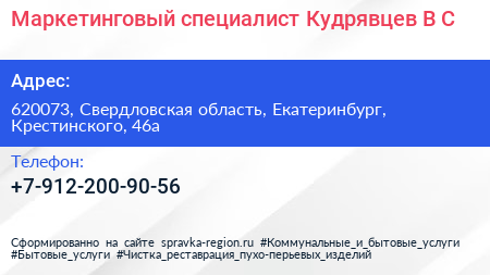 Маркетинговый специалист Кудрявцев В.С. по адресу 620073, Свердловская область, Екатеринбург, Крестинского, 46а в дальнейшем Организация, размещена в следующих категориях: