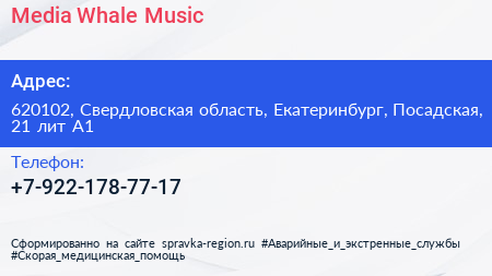 Media Whale Music по адресу 620102, Свердловская область, Екатеринбург, Посадская, 21 лит А1 в дальнейшем Организация, размещена в следующих категориях: