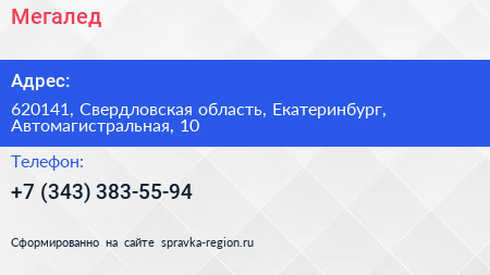 Мегалед по адресу 620141, Свердловская область, Екатеринбург, Автомагистральная, 10 в дальнейшем Организация, размещена в следующих категориях: