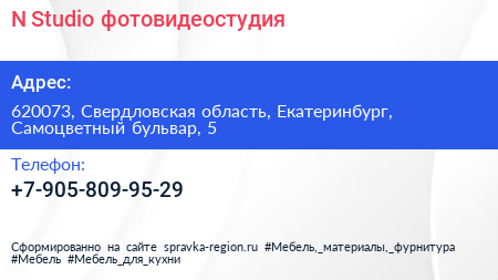 N-Studio, фотовидеостудия по адресу 620073, Свердловская область, Екатеринбург, Самоцветный бульвар, 5 в дальнейшем Организация, размещена в следующих категориях: