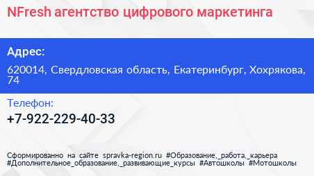 NFresh, агентство цифрового маркетинга по адресу 620014, Свердловская область, Екатеринбург, Хохрякова, 74 в дальнейшем Организация, размещена в следующих категориях: