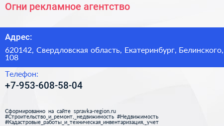 Огни, рекламное агентство по адресу 620142, Свердловская область, Екатеринбург, Белинского, 108 в дальнейшем Организация, размещена в следующих категориях: