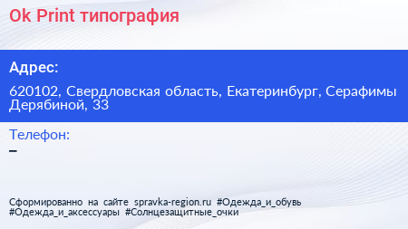 Ok!Print, типография по адресу 620102, Свердловская область, Екатеринбург, Серафимы Дерябиной, 33 в дальнейшем Организация, размещена в следующих категориях: