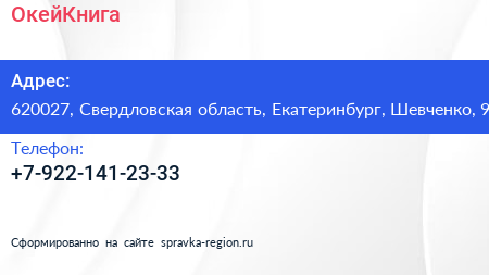 ОкейКнига по адресу 620027, Свердловская область, Екатеринбург, Шевченко, 9 в дальнейшем Организация, размещена в следующих категориях: