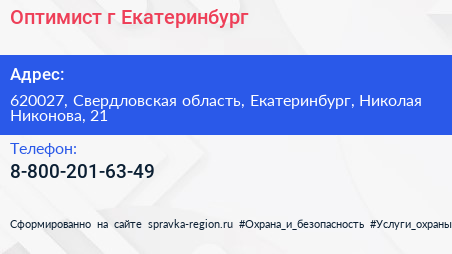 Оптимист, г. Екатеринбург по адресу 620027, Свердловская область, Екатеринбург, Николая Никонова, 21 в дальнейшем Организация, размещена в следующих категориях: