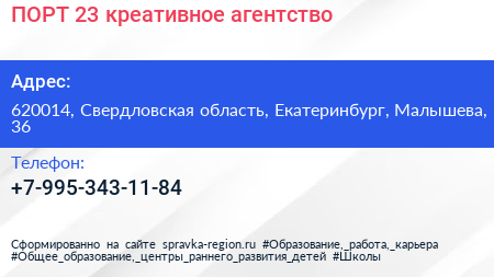 ПОРТ 23, креативное агентство по адресу 620014, Свердловская область, Екатеринбург, Малышева, 36 в дальнейшем Организация, размещена в следующих категориях: