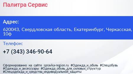 Палитра-Сервис по адресу 620043, Свердловская область, Екатеринбург, Черкасская, 10ф в дальнейшем Организация, размещена в следующих категориях: