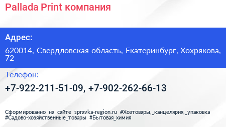 Pallada Print, компания по адресу 620014, Свердловская область, Екатеринбург, Хохрякова, 72 в дальнейшем Организация, размещена в следующих категориях: