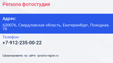 Persona, фотостудия по адресу 620076, Свердловская область, Екатеринбург, Походная, 76 в дальнейшем Организация, размещена в следующих категориях: