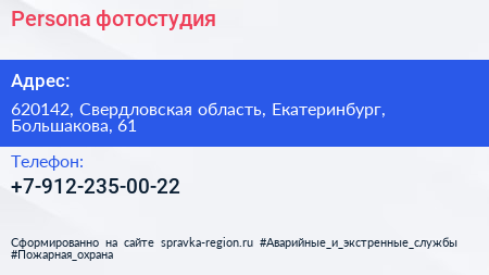 Persona, фотостудия по адресу 620142, Свердловская область, Екатеринбург, Большакова, 61 в дальнейшем Организация, размещена в следующих категориях: