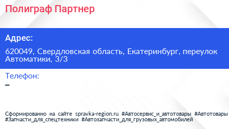 Полиграф-Партнер по адресу 620049, Свердловская область, Екатеринбург, переулок Автоматики, 3/3 в дальнейшем Организация, размещена в следующих категориях: