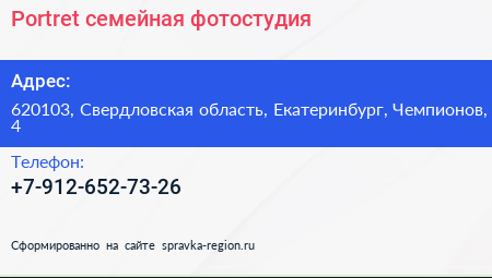 Portret, семейная фотостудия по адресу 620103, Свердловская область, Екатеринбург, Чемпионов, 4 в дальнейшем Организация, размещена в следующих категориях: