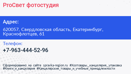 ProСвет, фотостудия по адресу 620057, Свердловская область, Екатеринбург, Краснофлотцев, 61 в дальнейшем Организация, размещена в следующих категориях: